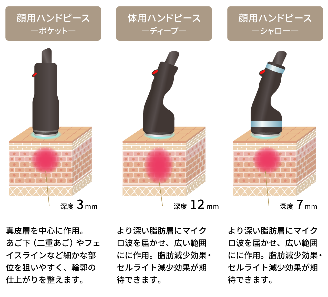 治療の目的や照射する層の深さに応じて、ハンドピースを使い分けることで顔だけでなく